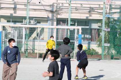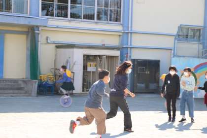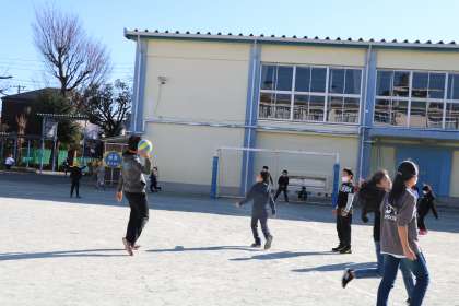 お天気も良く日差しが温かい休み時間です。友達と青s部のも楽しいですが、先生といっよに遊ぶのは、またさらに楽しいです。