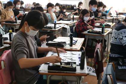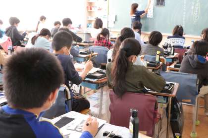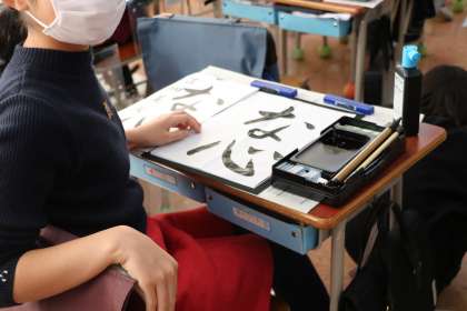 5年生は机の上で、半紙に2文字ずつ練習しています。先生と一緒に一文字一文字。ポイントを確認してから練習です。