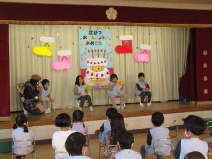 今日は12月生まれの皆さんの誕生会でした。お楽しみは“歌う会”の保護者の皆様によるハンドベル演奏でした。「いい音」「きれい」と聴き入っていました。