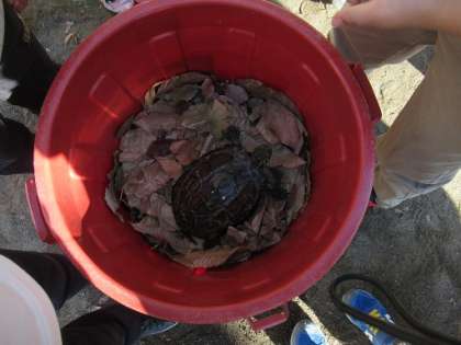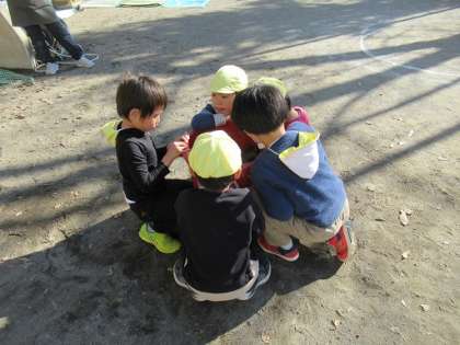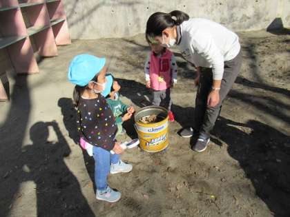 朝晩の寒さが厳しくなってきた頃から、カメさんたちはエサを食べなくなってきました。「エサを残してばっかり」「あんまり動かないね」とほし組の子どもたち。そうです、その通り。実はカメは外気温に体温が大きく左右される変温動物なので、外気温が下がるとカメの体温も下がって、地面の中や水の中で動かずにじっとして冬を越す生き物なのです。そこで、子どもたちに動物の冬ごもりについて知らせながら、カメさんたちを葉っぱのおふとんに引っ越しさせてあげることにしました。「ちーたん(カメの名前)またね」「あったかくなったら会おうね」と優しく落ち葉をかけてあげていました。暖かくなって春になるころは、みんなは1年生ですね。