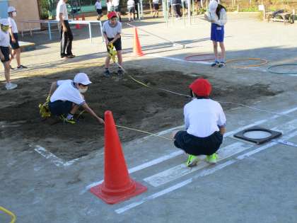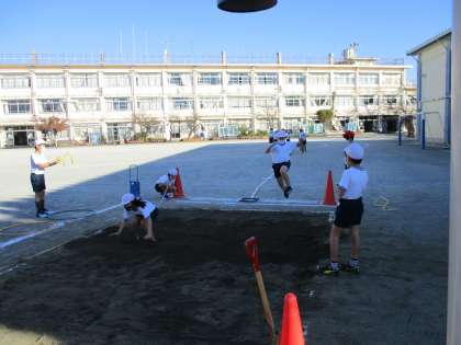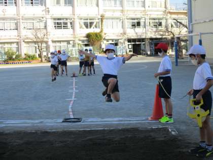 5年生の体育の授業です。走り幅跳びの学習でした。どの子も力強い踏切で跳んでいました。記録係が記録をしっかり測っていました。