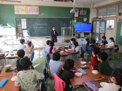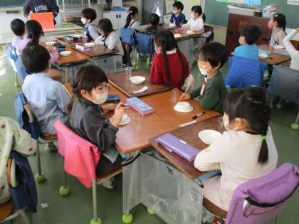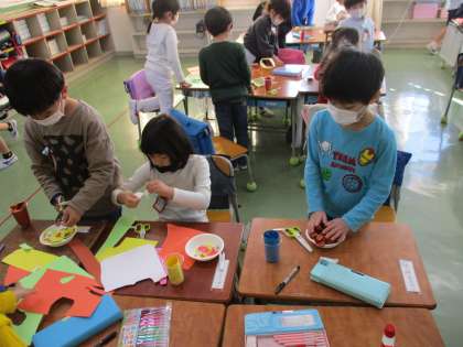 1年生の教室では、お楽しみ会の準備が行われていました。色画用紙を使って乾杯するジュースと食べ物を作っていました。お楽しみ会が楽しみですね。