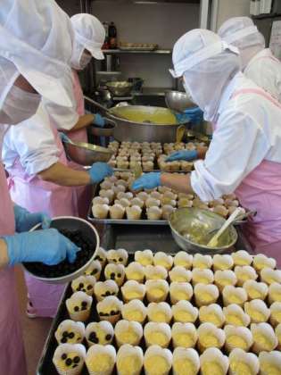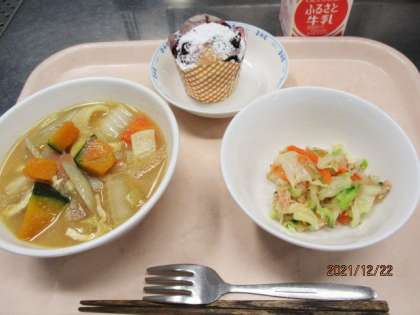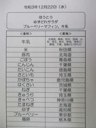 今日の給食は冬至こんだてです。冬至にかぼちゃを食べたり、ゆず湯に入ったりするとかぜをひかないといわれています。かぼちゃが入った山梨県の郷土料理の「ほうとう」と、ゆずのしぼりじるを入れたゆずドレッシングのサラダを作りました。デザートのブルーベリーマフィンも手作りです。焼き上がった後、粉砂糖をかけて雪をイメージしました。今日は2学期最後の給食だったのですが、こどもたちから給食への感謝の言葉をもらえてとてもうれしかったです。写真はブルーベリーマフィンを作っているところです。