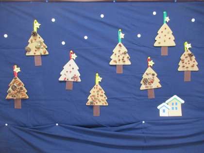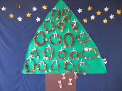 保育室には自然物や折り紙で作ったクリスマスの飾りを飾っています。明日の終業式には持ち帰りますので、お家に飾ってくださいね。