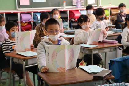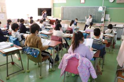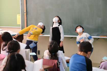 2年生日本語「いっぽんみちを あるいていたら」の学習の様子です。今日は、「登場人物を演じてみよう」ということで、物語に出てくる登場人物の様子を体の姿勢や動きを工夫して表現することに挑戦しています。音読する子も、演じる子もがんばっています。