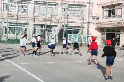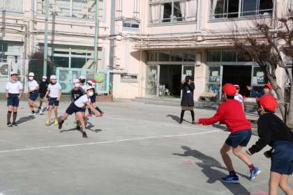 4年生は3コートを使っています。どのコートからも「どんまいどんまい」「ナイスキャッチ」「いいよ!今の!」など、子ども同士の温かい声が飛びます。