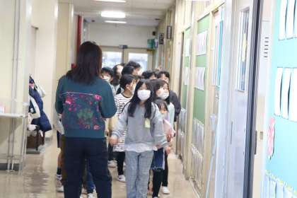 1年生教室前の廊下では、各学年の書き初めを見て回る3年生に出会いました。