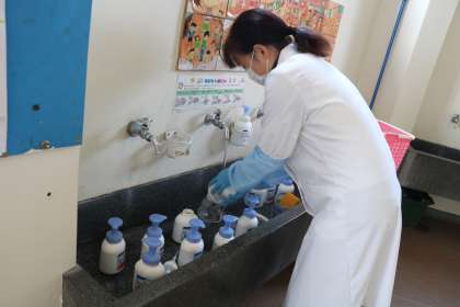流しでは、手洗い石鹸のボトル洗浄と補充もやっていました。