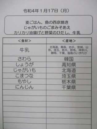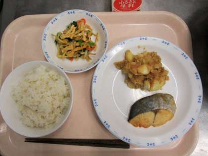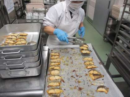今日の魚はサワラです。サワラは身がやわらかく、かすづけやみそづけにむいています。今日は西京みそをつけこんでから焼いた「西京焼き」にしました。写真は焼きあがった西京焼きをクラスごとに数えて配かんしているところです。