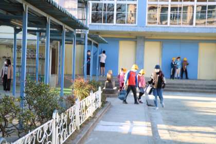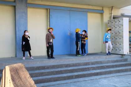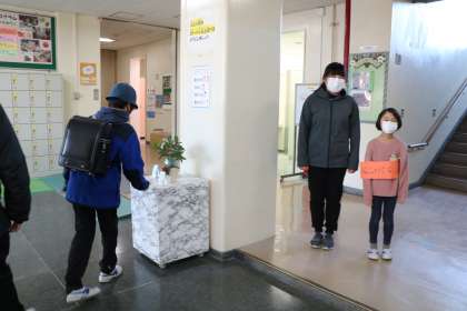 1年生のあいさつ隊の元気な声が昇降口から聞こえてきました。今日も元気に一日がスタートです。朝のしたくを終えて、外に遊びに出てくる1年生の様子です。