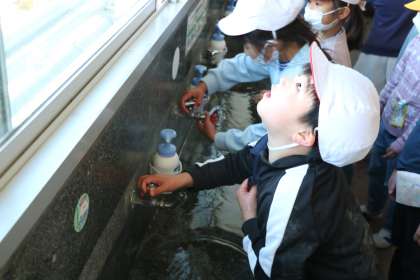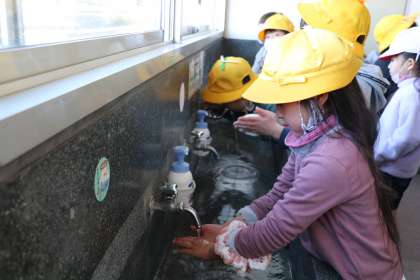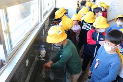 遊びが終わったら、しっかりうがい手洗いをして教室に入ります。