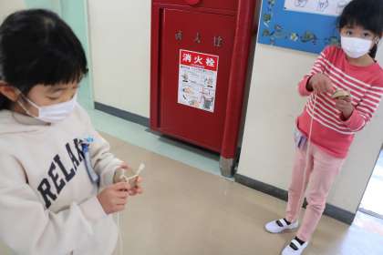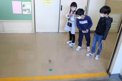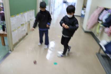 1年生生活科の様子です。廊下ではコマ回しに挑戦です。