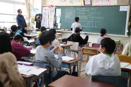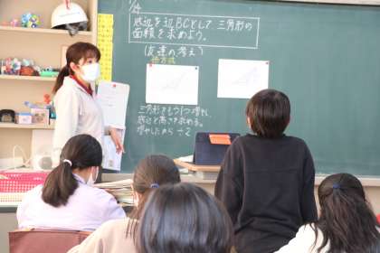 5年生算数の様子です。三角形の面積を求めるには?今まで学習したことを使って様々なやり方を考えています。