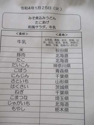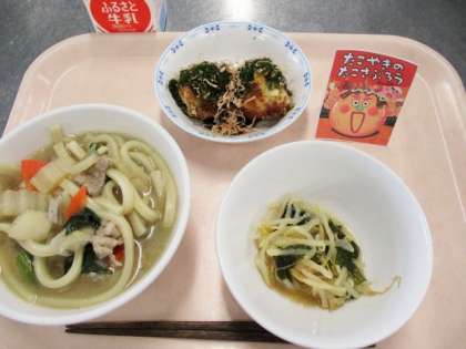 お話給食の二日目は、「たこ焼きのたこさぶろう」という絵本をイメージした給食です。給食の前に絵本を読んだこどもたちから「たこは入っていますか?」と聞かれました。「たこさぶろうにはたこが入っていないけど、給食のたこ焼きにはたこがたくさん入っていますよ。」と伝えると「やったー!」と喜んでいました。「たこ焼き、とっても