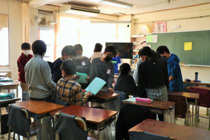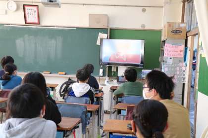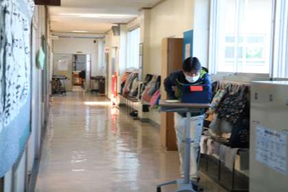 6年生の朝の会の様子です。今日は、教室では班ごとに話し合うことがあるので、廊下で別途オンライン朝の会をやっています。朝の会が終わると朝学習です。6年生は外国語です。