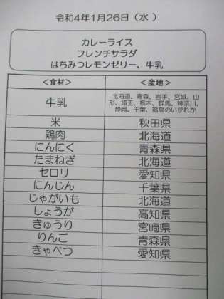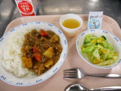 いつもの給食のカレーライスは、バターと小麦粉とカレー粉で手作りしていますが、今日はバターを使わずにサラダ油と小麦粉とカレー粉でルウを作りました。そうすることによって、給食に使われる食材にアレルギー原因食物がなくなり、砧小全員で同じカレーライスを食べることができます。「ひいきにかんぱい!」という本に出てくるカレーライスをイメージして作りました。はちみつレモンゼリーはリクエスト給食です。