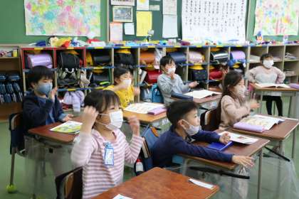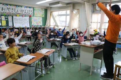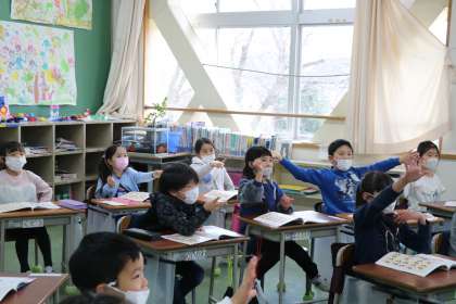 1年生音楽「おちゃらかほい」の様子です。先生を相手に、遊びながら歌います。「おちゃらかほい」で勝ったとき、負けたとき、あいこのときとポーズを決めながら楽しんでいます。