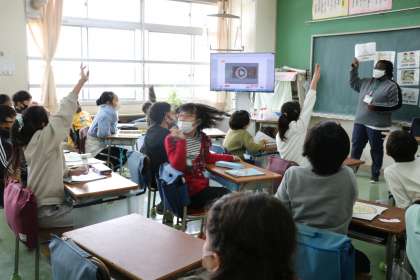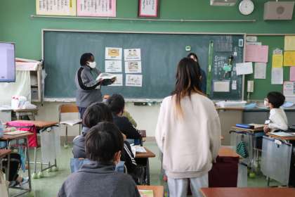4年生外国語の様子です。学校の中の様々な部屋・施設の言い方の学習です。ちょうど、「校長室」の発音の仕方を教えてもらっているときでした。