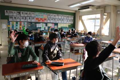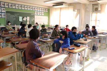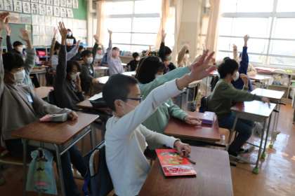 写真は、放送集会に取り組んでいる教室の様子です。教室にいる6年生も楽しんでいました。
