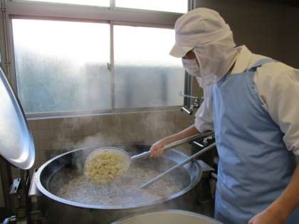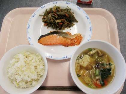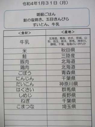 1月24日から1月30日は全国学校給食週間でした。学校給食は明治22年に山形県の忠愛小学校で無償で昼食を提供したのが始まりです。その時提供されたのはごはん、鮭の塩焼き、漬物でした。今日は学校給食にちなんだ献立にしました。写真は別の鍋で作ったすいとんをだし汁に入れているところです。
