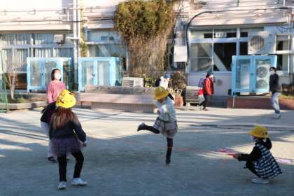 1年生は少し早めに教室に上がるので、遊びに出てくるのも一番です。短縄跳びをしたり縄を別の遊びに変えて楽しんだりしています。
