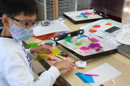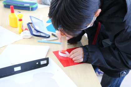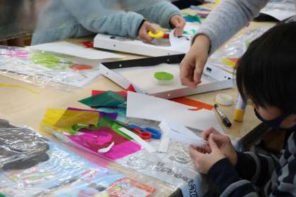 作品が完成して友達の作品を鑑賞している子も、最後のひと踏ん張り、細かい作業をしている子もいます。時々光をかざしながら出来栄えを確認し、また続きを作ります。