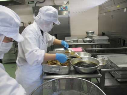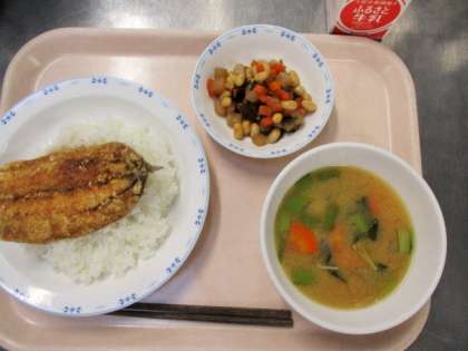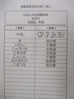 今日は節分です。給食ではいわしと大豆を使った節分献立にしました。蒲焼き丼はこどもたちから人気のある献立です。いわしやさんまで作ることができます。2月の給食だよりにレシピをのせていますので、ぜひ作ってみてください。