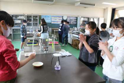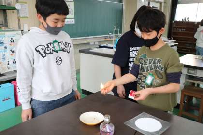 4年生理科「もののあたたまりかた」の様子です。実験の前に、マッチとアルコールランプの使い方を一人ひとり確認します。上手にマッチに火が付くと思わず拍手がおこります。みんな緊張感をもってしっかり練習しています。