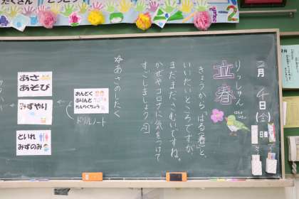 朝、1年生の教室の黒板です。すてきな黒板に迎えられ、子どもたちは元気に朝遊びに出かけていきます。