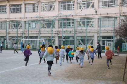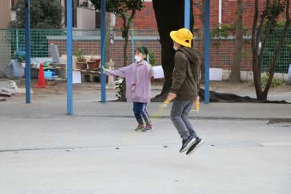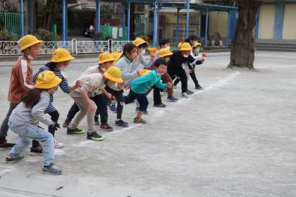線があると走りたくなるのか?先生にゴールから合図を送ってもらい、何度もかけっこを楽しんでいます。