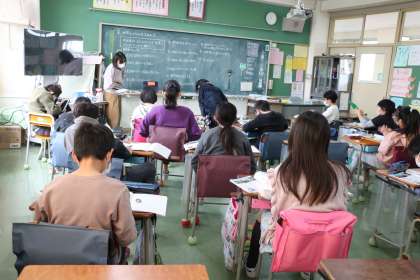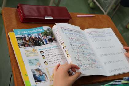 4年生社会「世界とつながる大田区」の学習の様子です。写真や資料からいろいろなことを読み取っています。ノートもしっかり取りながら考えています。