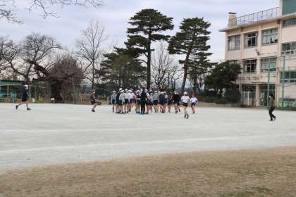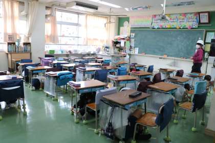 校庭で持久走をしていた6年生もサッと校庭の真ん中に集まります。理科室の4年生も、教室の1年生もおしゃべりをしないで身の安全を確保する行動をしています。