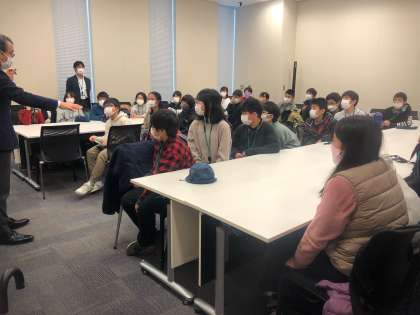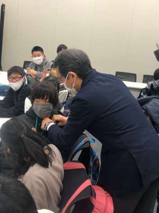 お弁当の後、政治家の仕事についてお話を聞きました。議員バッチを見せていただき、試しにほんの少し、付けさせていただけた子もいました。