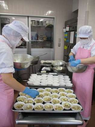 写真はポテトオムレツを作っているところです。具のたまねぎ、豚挽肉はじっくり甘みがでるまで炒めてから、じゃがいもも先に蒸してからたまごと合わせてカップに流してオーブンで焼いています。上にはケチャップと赤ワインを合わせて加熱したソースをかけてあります。