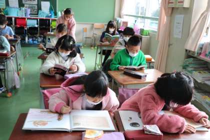 2年生図書の様子です。図書館で司書の先生に相談したり、おすすめの本を教えてもらったり、それぞれの本を選んで静かに読書に集中しています。