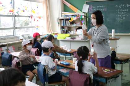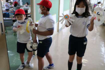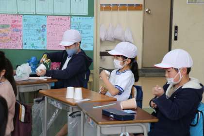 1年生生活科「かぜとあそぼう」の様子です。紙コップで風車を作っています。これから屋上で、実際に完成した風車で遊ぶクラスもありました。