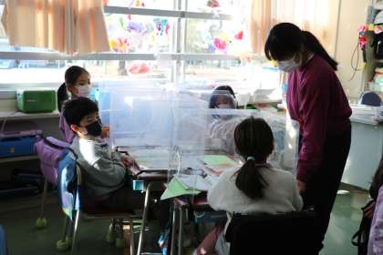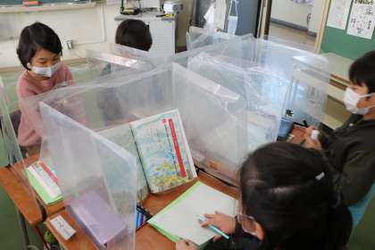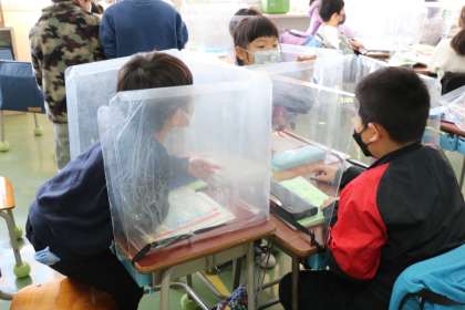 1年生「教科日本語」の学習の様子です。グループで話し合い学習をするときは、短時間にして、パーテーションを立てて行っています。