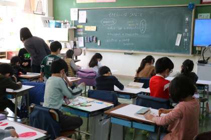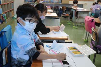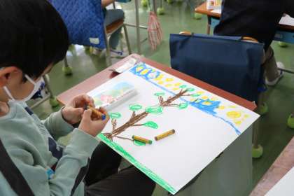 1年生図工「できたらいいなこんなこと」の様子です。先生が一人ひとりの絵についてのお話を丁寧に聞いてくれます。一生懸命描いている子も、先生が聞いてくれて、「いいねえ!」と言ってくれると嬉しそうです。