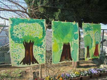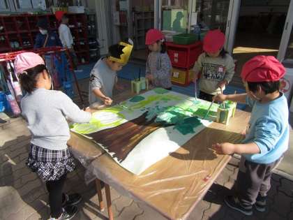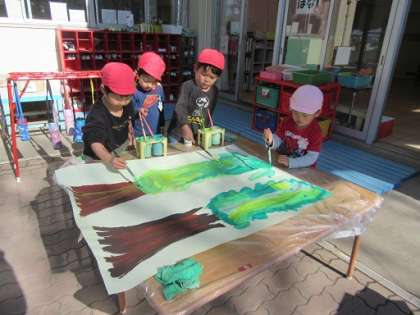 今日はAグループが、絵の具で大きな木を描きました。木がたくさん出来てきて、本当の森みたいになってきました。