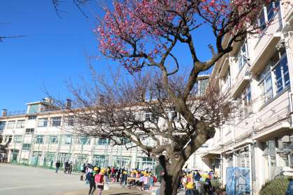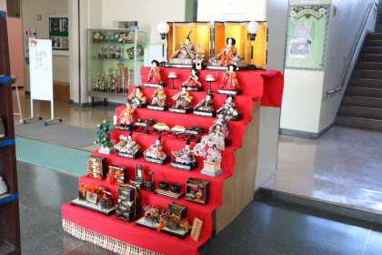東昇降口にはひな人形が飾られています。校庭の桃の花もだいぶ花が咲きました。