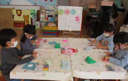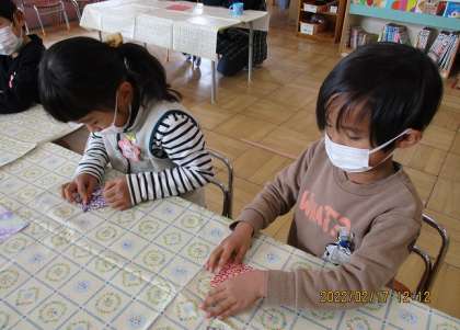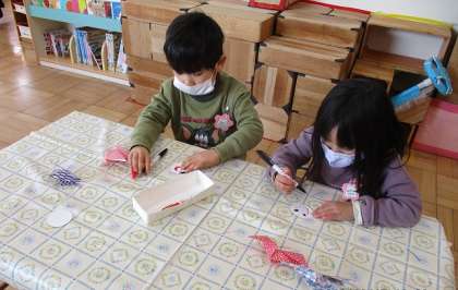 はな組さんは、折り紙でひな人形を作りました。折り紙を折ったり、糊で貼ったり、みんな丁寧に作っていました。