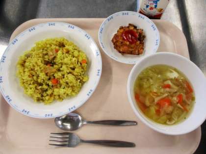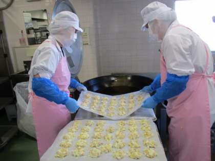 大豆とホールコン、ハム、たまねぎを小麦粉とベーキングパウダーが入った衣であえて、油で揚げました。写真は油にフリッターを入れている様子です。