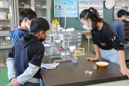 タブレットを置き、オンライン学習をしている友達も一緒に観察しています。