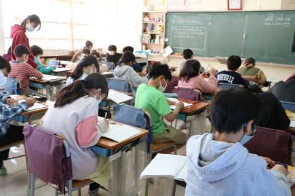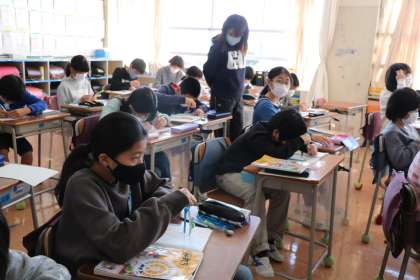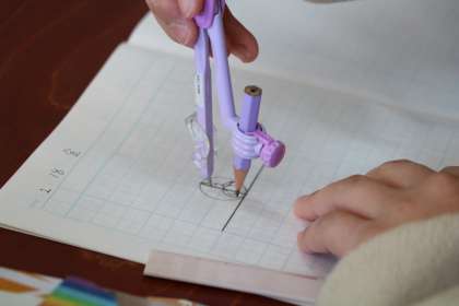 5年生算数「正多角形と円」の学習の様子です。小さい円を、コンパスを使い丁寧に描いています。