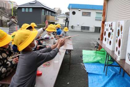 今日は、子供達が楽しみにしている「二の午」の日です。学校の近くの妙法寺さんで昔遊びを楽しませていただきます。町会の方がたくさん遊びの先生としていてくださるので、いろいろな遊びをたっぷり楽しむことができます。写真は1年生