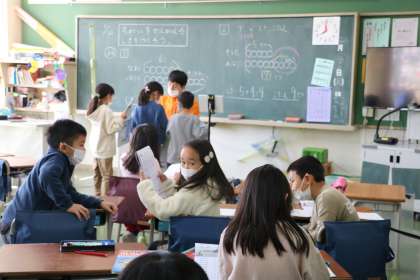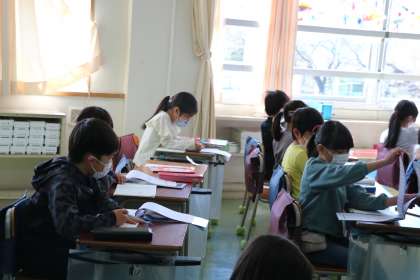 1年生算数の様子です。算数ドリルを使い、学習したことの確かめ問題に取り組みます。