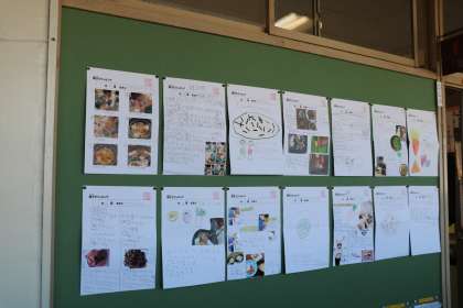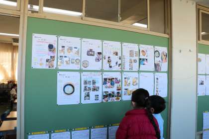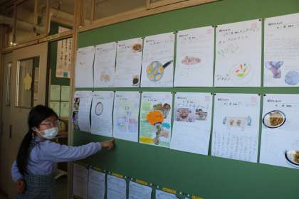 学校の畑で収穫した大根を使い、冬休み中「親子でクッキング」に挑戦していただきました。おでん、お味噌汁、大根の葉っぱのふりかけ、大根の煮物、大根のサラダ・・・たくさんのクッキング報告がありました。教室前廊下に飾られると、子どもたちも一生懸命見ています。