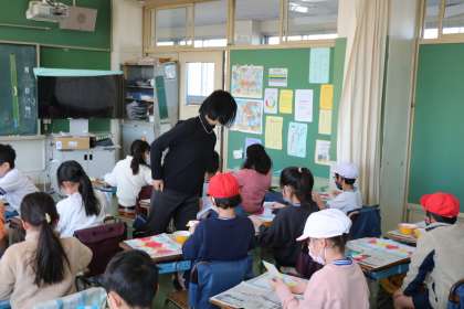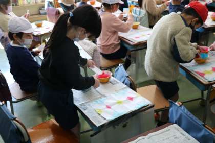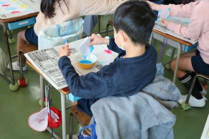 2年生の図工の授業です。インクと半紙を使って「いろいろもよう」を作っていました。半紙の折り方やインクへの浸し方を工夫しておもしろい模様ができていました。