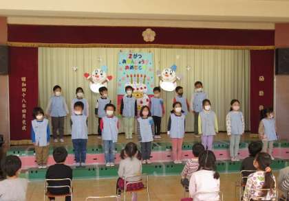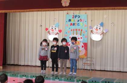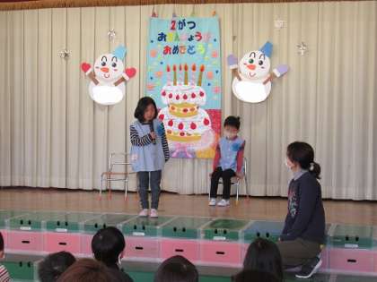 今日は2月生まれの皆さんの誕生会でした。司会の担当は、はな組さんです。「ドキドキする」と言っていましたが、上手に立派にできました。園長先生やほし組さんに、「上手だった」「かっこよかった」とたくさんほめてもらい誇らしげでした。
