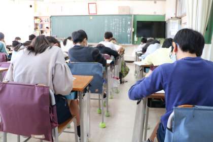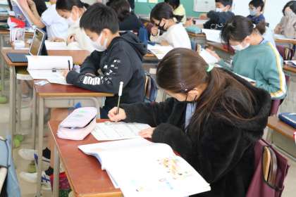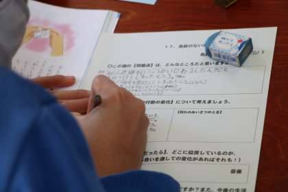 5年生道徳の様子です。自分の考えをワークシートに書いています。この後、互いの考を発表して聞いたり話し合ったりします。